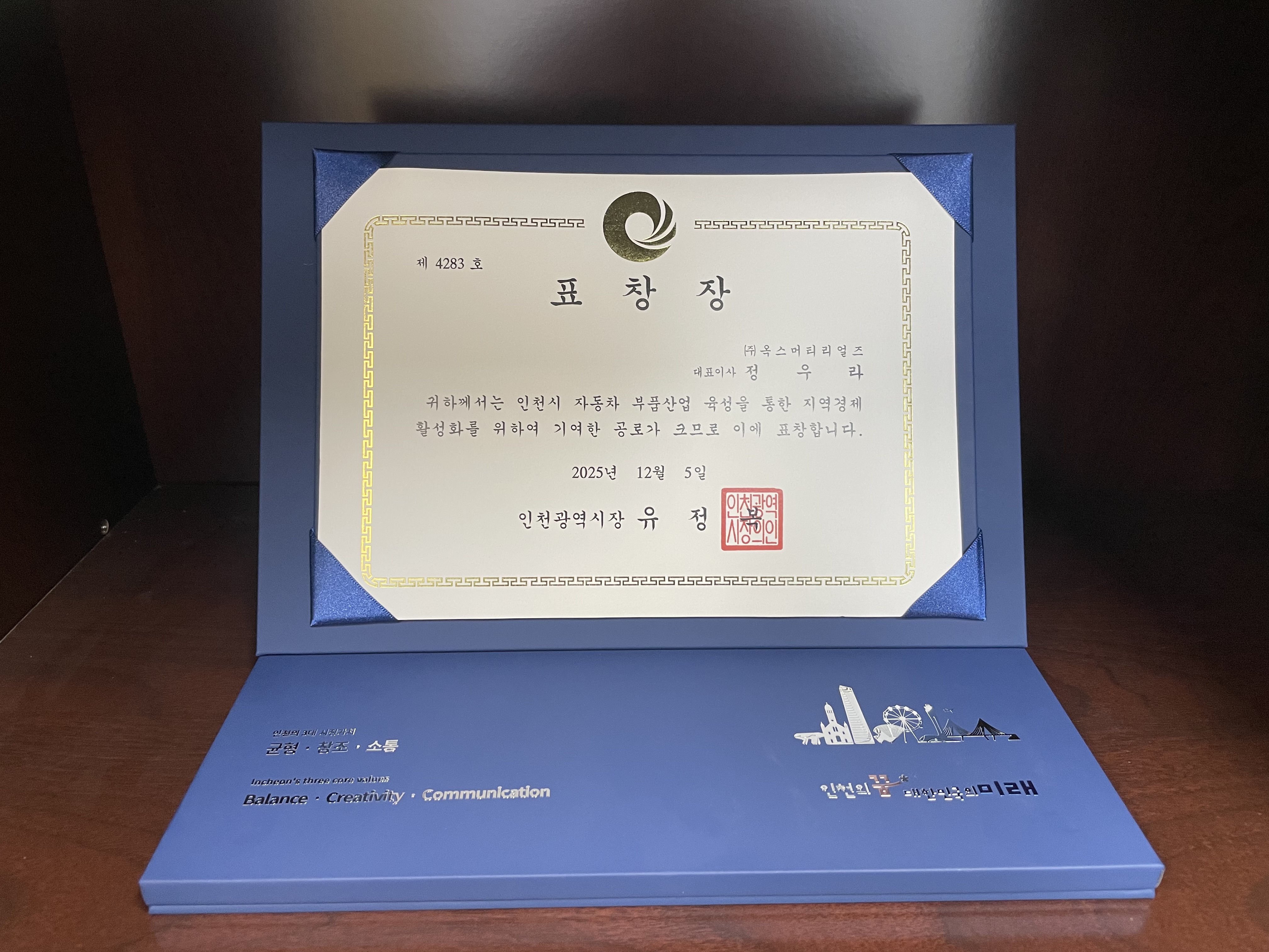 옥스머티리얼즈는 인천테크노파크 미래차센터 주관으로 2025년 12월 11일부터 12일까지, 더위크앤 리조트에서 개최된 인천 미래차 성과공유회 및 워크숍에서, 인천시 자동차 부품산업 육성 및 지역경제 활성화에 기여한 공로를 인정받아 인천광역시 표창장을 수상하였다.